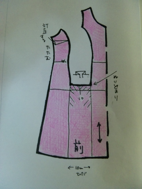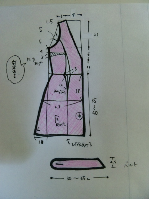 ところどころ寸法書いてないな…。バストラインは21.5、ウエストは1.5センチとダーツに3センチずつ取ってます。ヒップラインは考えてない。肩を3センチにしてますが、4センチ取っても別に問題なす。