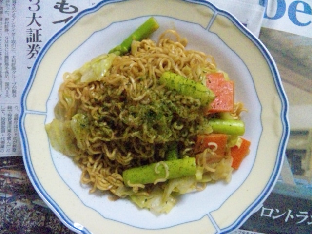 なんだろう?焼きそばいうたらUFOちゃうの?と思ってるからか、あの独特のフルーティな香りと、どろっと感がないとソース焼きそばやと思えない。ていうか、アラビヤンは粉末「ソース」がついてたけど、ソース焼きそばと言う訳ではない?のかな?? 麺は完全にサッポロ一番のらーめんと見た目一緒。