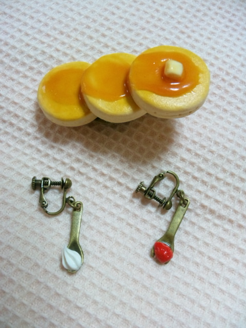 ほんで、今日の戦利品は きゃわたんボトルに入ったイヤリング(スプーンにクリーム、フォークにイチゴが乗っている)と、ホットケーキのヘアピンです。ドヤ顔で家帰ったら母に盛大に笑われました。何故だ、どうしてだ?よく、分からない。こんな美味しそうなホットケイクなかなか無いであろう!!